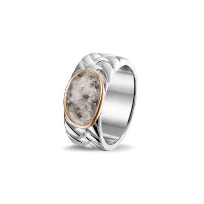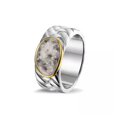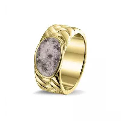 Gevlochten ring met as compartiment op de bovenzijde. Dit sieraad wordt zichtbaar aan de bovenkant gevuld met as of haar en wordt vermengd met onze speciale hars.