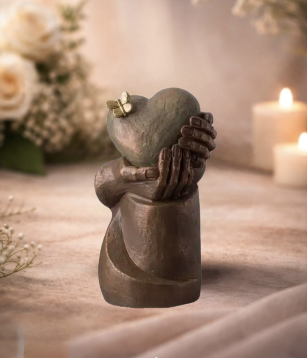 Wat deze urn zo speciaal maakt, is dat het niet meteen herkenbaar is als een urn. Het ziet eruit als een mooi kunstwerk dat je gewoon in je woonkamer kunt neerzetten. Door de combinatie van de hartvorm, de handen en de bronskleur voelt het als een troostende herinnering die je iedere dag een beetje steun kan geven. Het is een manier om iemand dicht bij je te houden, zonder dat het meteen over verlies hoeft te gaan.